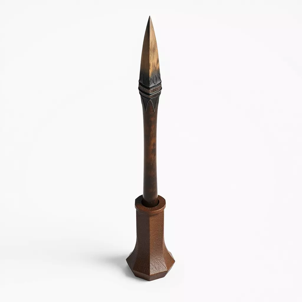 This highly detailed 3D model presents a distinctive wooden spear, elegantly paired with an ornate display stand, perfect for enriching your digital environments. The spear features a meticulously crafted, sharp wooden tip with a burnt effect, transitioning into a slender shaft adorned with intricate carvings near the head, providing an authentic ancient or fantasy aesthetic. The accompanying stand boasts a robust, textured finish, possibly mimicking aged metal or stone, with a stable hexagonal base designed to showcase the spear prominently. This versatile asset is ideal for a wide range of applications including immersive game development, historical or fantasy-themed architectural visualizations, compelling augmented reality (AR) and virtual reality (VR) experiences, or as a striking element in digital art compositions. Optimized for real-time rendering, this model is built with clean topology and is fully UV unwrapped, ensuring ease of integration into any project. It comes with high-quality PBR textures for realistic material representation. Supporting multiple industry-standard file formats such as GLB, OBJ, FBX, and USD, it offers maximum compatibility and flexibility for your creative workflow, ready for immediate use in your next project.