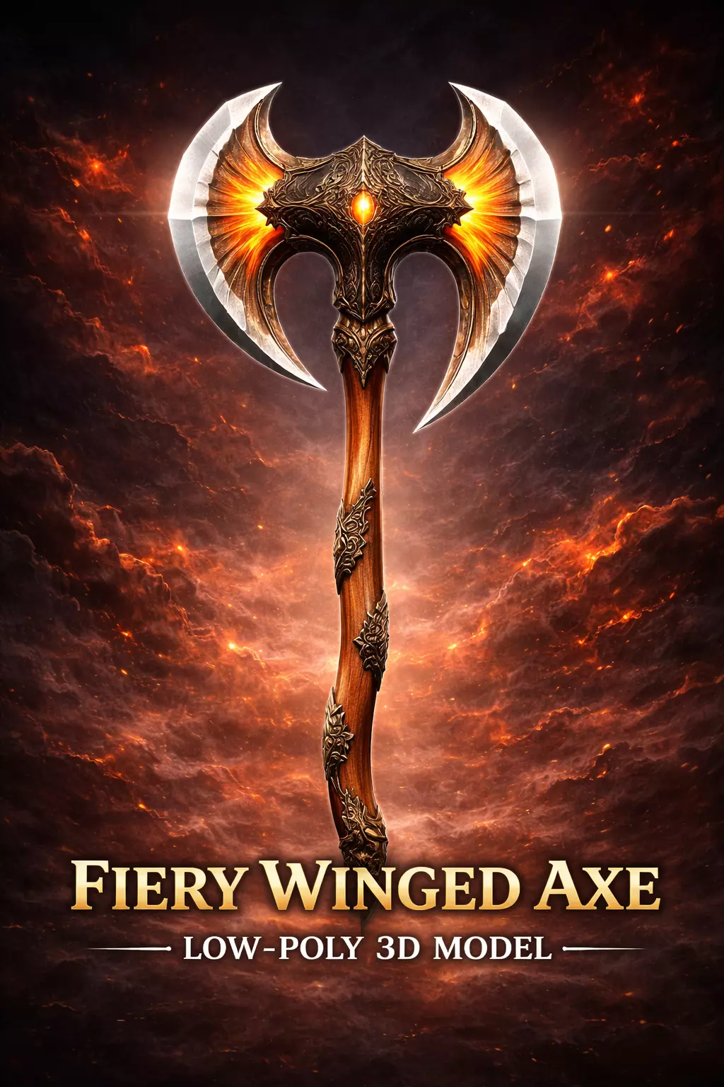 Fiery Winged Axe is a stylized fantasy weapon featuring a dramatic wing-shaped blade design with fiery accents emerging from the center structure. The detailed ornamental head combined with a curved wooden handle gives the axe a powerful and mythical appearance, making it ideal for fantasy games, RPG environments, cinematics, and real-time rendering projects.The model is optimized and game-ready, built with efficient topology and clean UVs. High-quality PBR textures created in Substance Painter provide realistic material response in modern engines such as Unreal Engine and Unity.