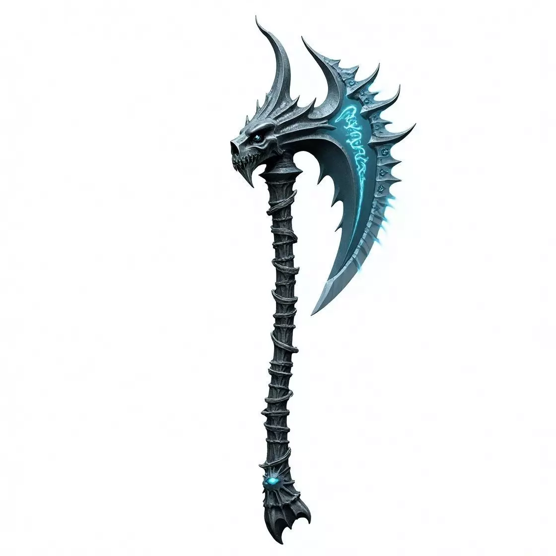 Sculpted dragon headGlowing frost runesIce crystal effectsDetailed scale textureWrapped grip handleFantasy RPG ready