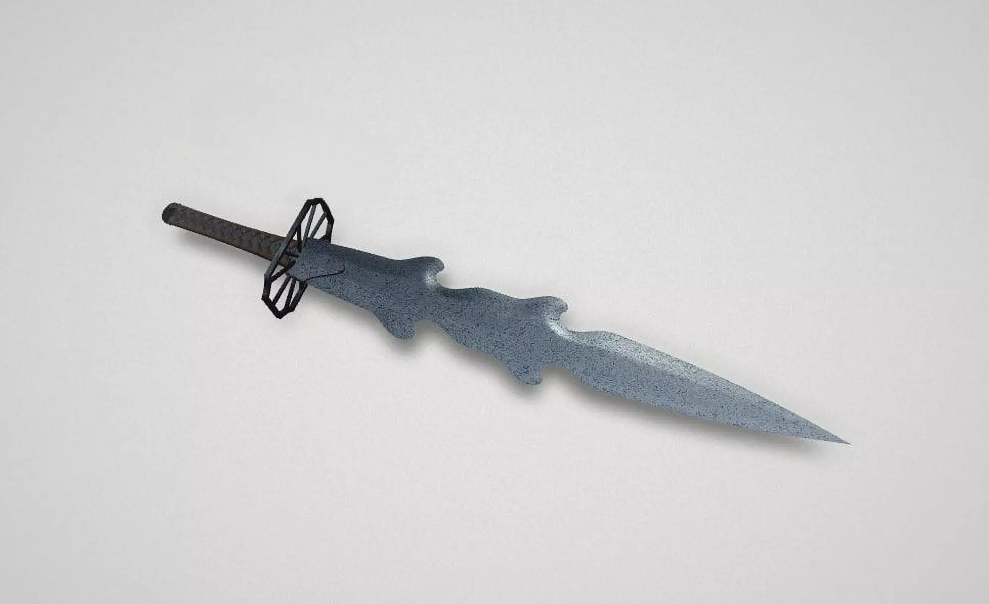 This 3D sword model is a captivating departure from the norm, featuring a unique silver blade with two distinct wavy protrusions on both sides. The leather-wrapped hilt provides both style and comfort, while the circular guard adds an element of distinctive flair.