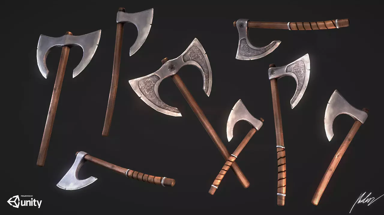• 8 Variations of Axes with ornaments and grips(.fbx): 2 double bitted axes, 3 twohand axes, 3 onehand axes