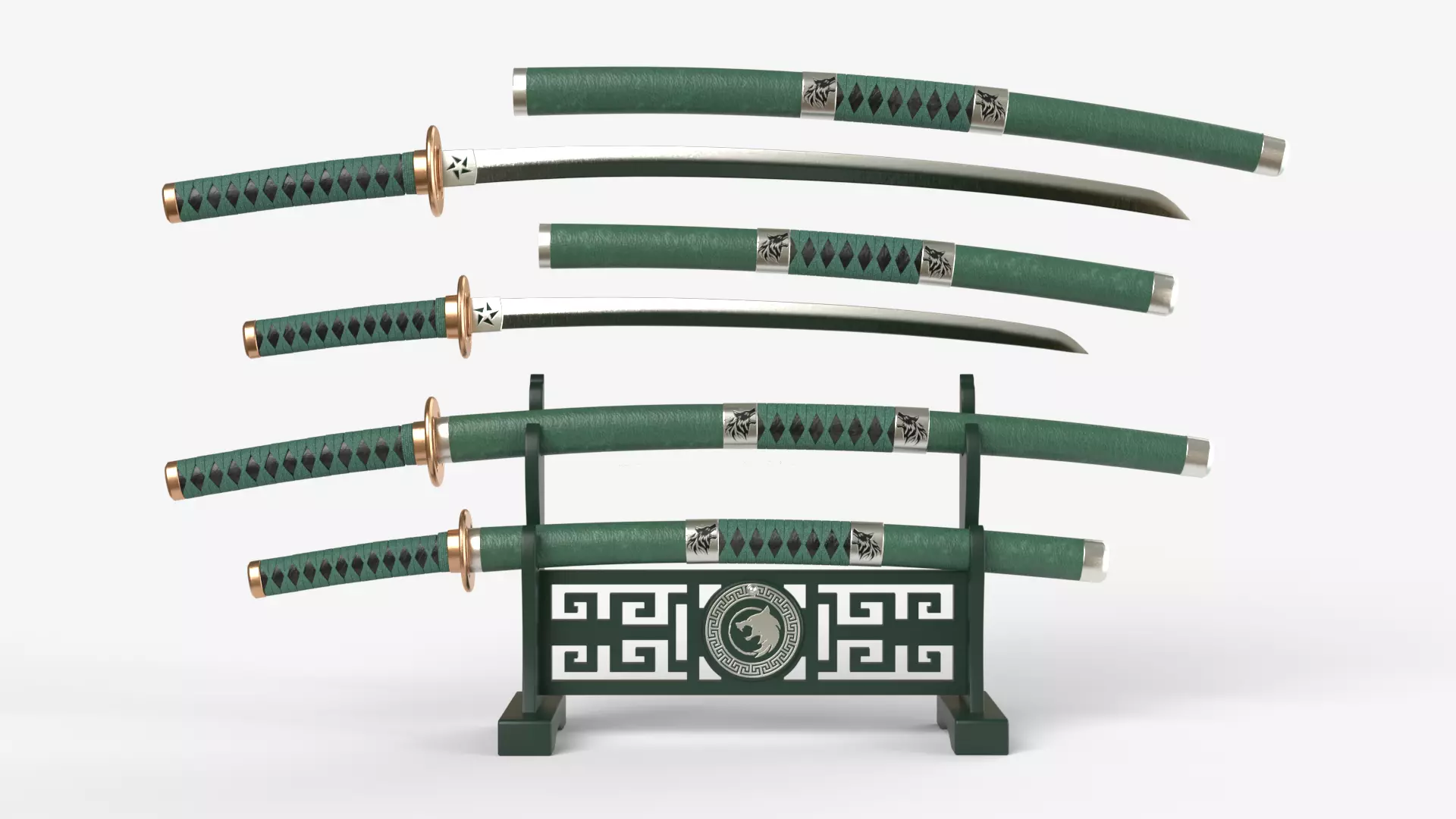 Green Double Bladed Samurai Katana Wakizashi and Stand the model features clean geometry (no N-gons) , unwrapped UV maps,high-resolution 2K and 4K PBR textures.