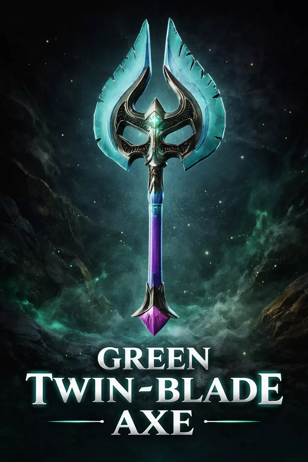 Green Twin-Blade Axe is a stylized fantasy weapon designed for games, cinematics, and real-time rendering projects. The axe features a unique twin-blade crescent design with sharp wing-like edges and an arcane-inspired center structure, giving it a mystical and powerful appearance suitable for fantasy RPG environments.