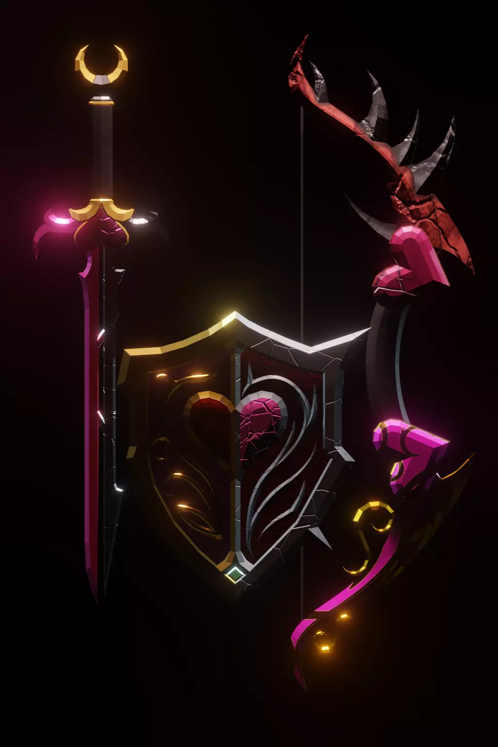 A stylized fantasy weapon set inspired by the duality of love—bright and passionate on one side, dark and fractured on the other. Each weapon blends elegance with battle-worn detail, perfect for RPGs, fantasy projects, or stylized adventures.