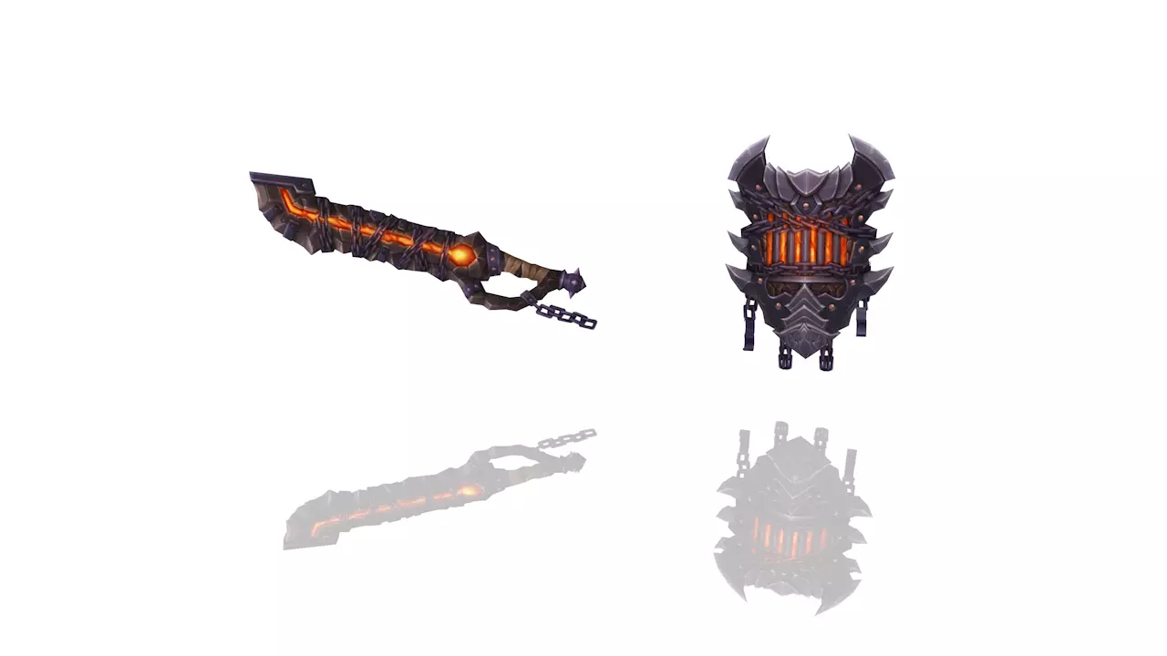 A set of a sword and a shield in a hell/demon style that comes with two variants, for the price of only one model.