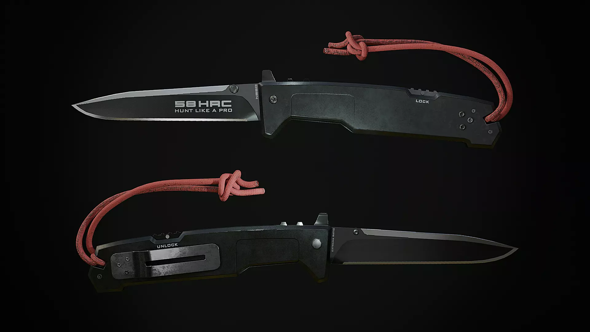 A knife with a plastic handle and a metal clip and a beautiful metal blade with a strap in different colors