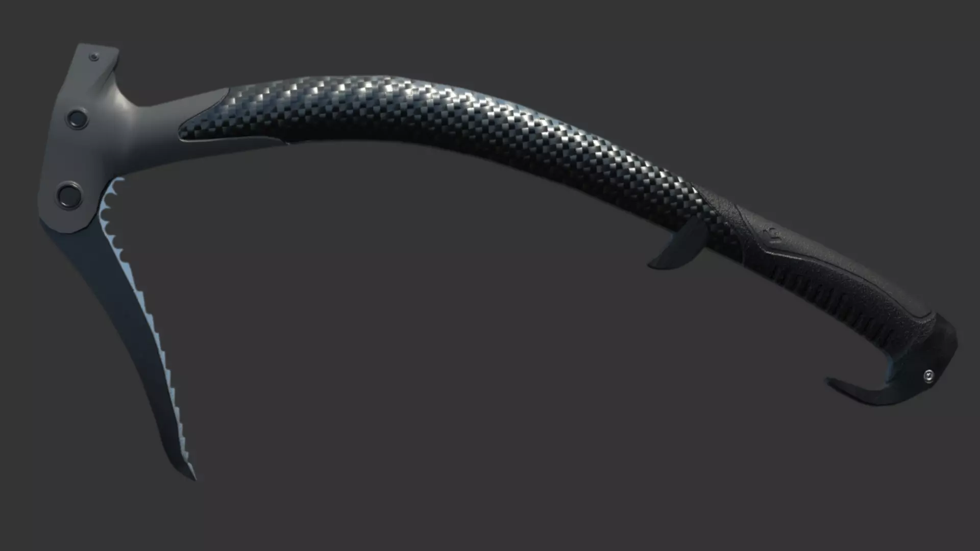 This is a high-quality 3D model of a modern technical ice axe, designed with a sleek, ergonomic silhouette and premium materials. The model features a carbon-fiber shaft, a serrated steel pick, and a textured rubber grip, making it ideal for realistic outdoor, mountaineering, or survival-themed scenes.