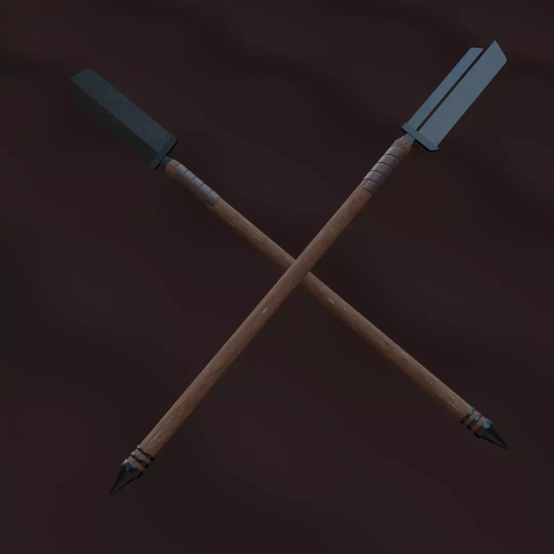 This weapon resembles a naginata, which is a traditional Japanese pole weapon. A naginata typically features a long, curved blade mounted on a wooden shaft. The one in your image appears to have a unique blade design with two parallel blades, which is not typical of traditional naginata but could be a stylized or customized version.