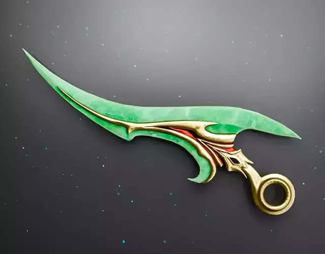 This low-poly, game-ready short blade features an elven style blade made of jade, with elegant curved details and a golden elven-style handle. It is designed for high-quality visuals while staying optimized for real-time use, featuring high-poly normal bakes for added realism.