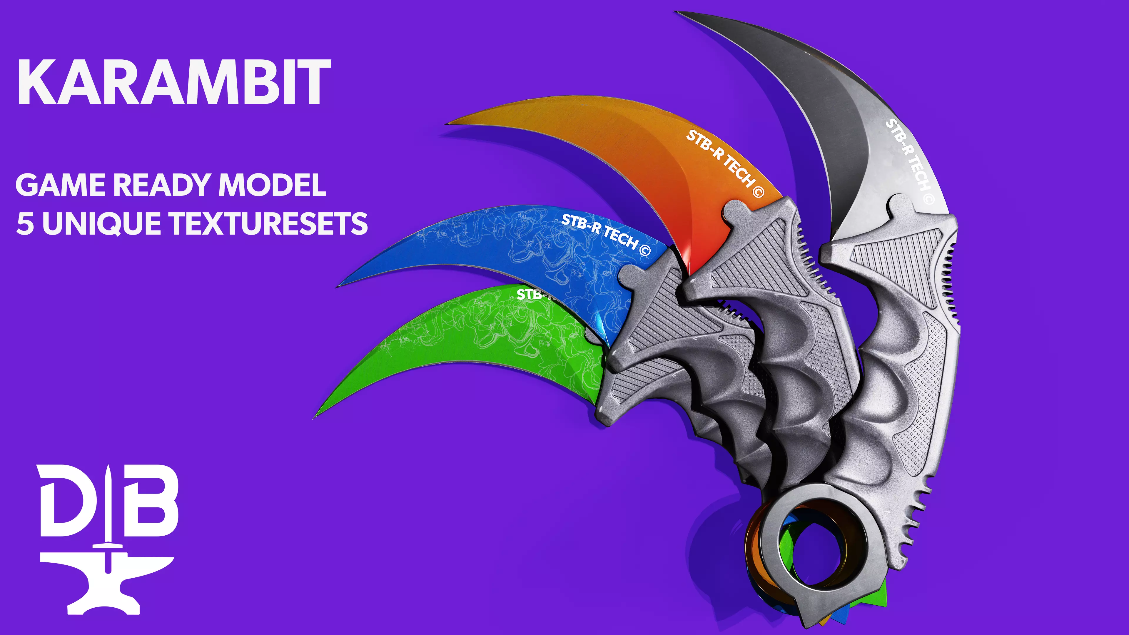 This is a game-ready karambit, primarily meant to be used in a first-person setting. You will find no trademarked Icons in the textures, instead all branding is custom-made.