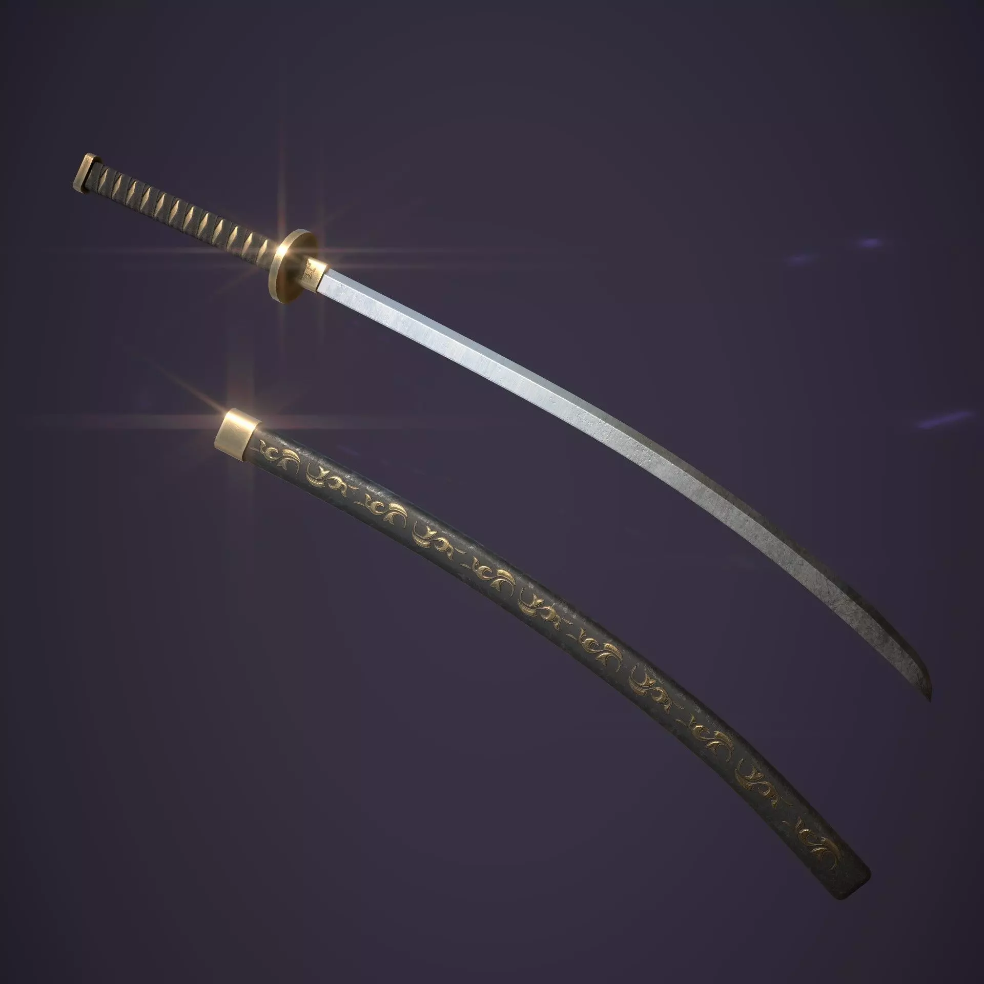 This 3D model showcases a beautifully crafted katana with a detailed, ornate sheath. The blade features a realistic metallic texture and slight curvature, while the hilt and fittings are accented with gold, exuding elegance and traditional Japanese craftsmanship. Normals directx, mesh triangulated. If you purchase, please dont forget to leave a review.