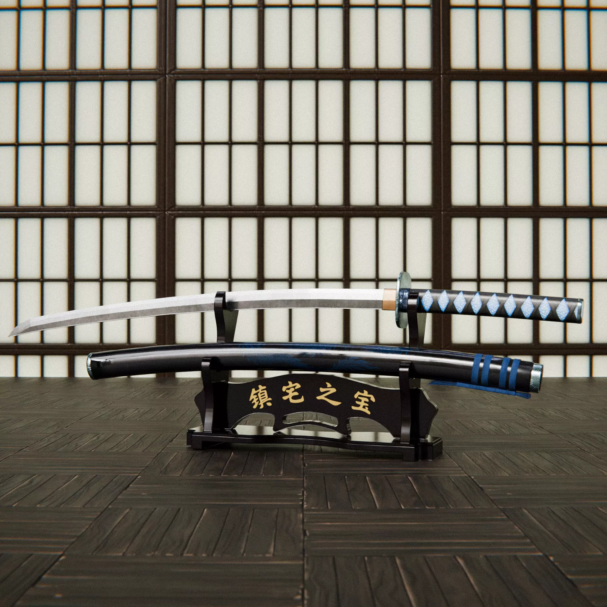 Overview:This detailed and realistic 3D model of a traditional Katana sword with saya (scabbard) and a wooden display stand is designed for use in high-quality renders, cinematic scenes, real-time games, VR/AR applications, and collectibles visualization. Modeled in Blender and rendered in Cycles, the asset reflects authentic proportions and material fidelity, ideal for close-up shots.