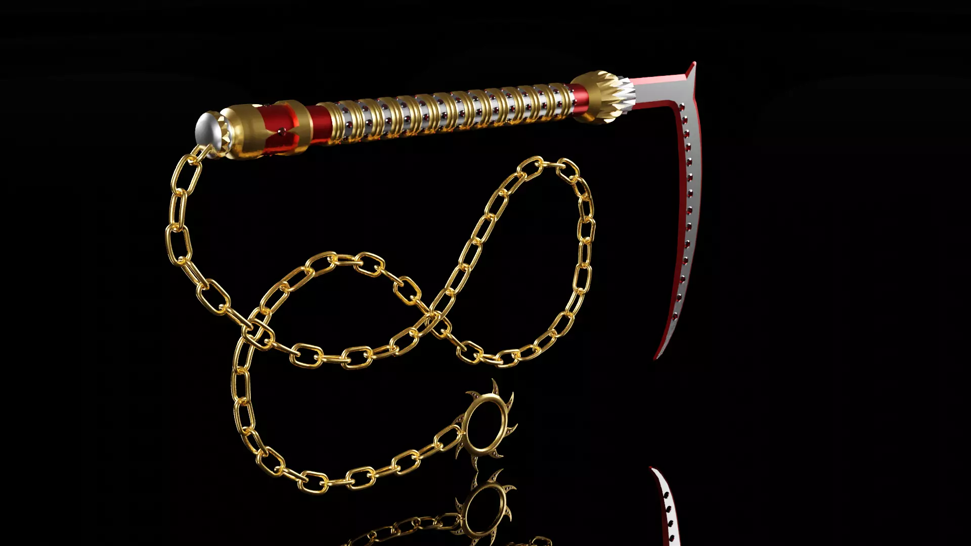 The model was created in blender version 3.6.It is a model of the Chinese weapon Kusarigama Bloody Priest, which is made of gold, iron, red metal and rubies. It has a small saw at the end of the chain. The kusarigama model itself is taken from the game shadow fight 2. If you are looking for some unusual model for your projects or for games like shadow fight 2, then you can buy the best models from me.