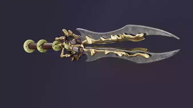 A high-quality, intricately designed Fantasy Dual-Blade perfect for RPGs, cinematic renders, and high-end games. This model features a unique organic design with golden filigree and weathered steel blades, providing a blend of elegance and lethality.