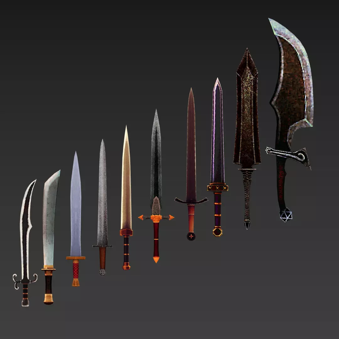Low poly low resolution sword pack, 10 game ready assets, 128x128 PNG textures, 200-600 tris per mesh.