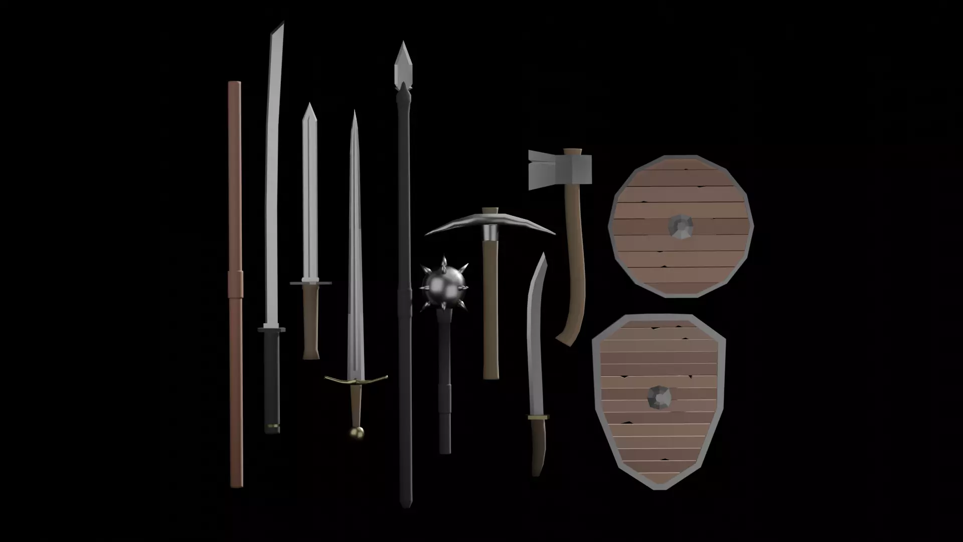 Some simple low poly medieval weapons, and shields, for all of your adventuring needs. Game ready for your own fun, low poly game!This 2.0 pack includes a bit more variety than the last in hopes to bring more joy and bank for your buck.