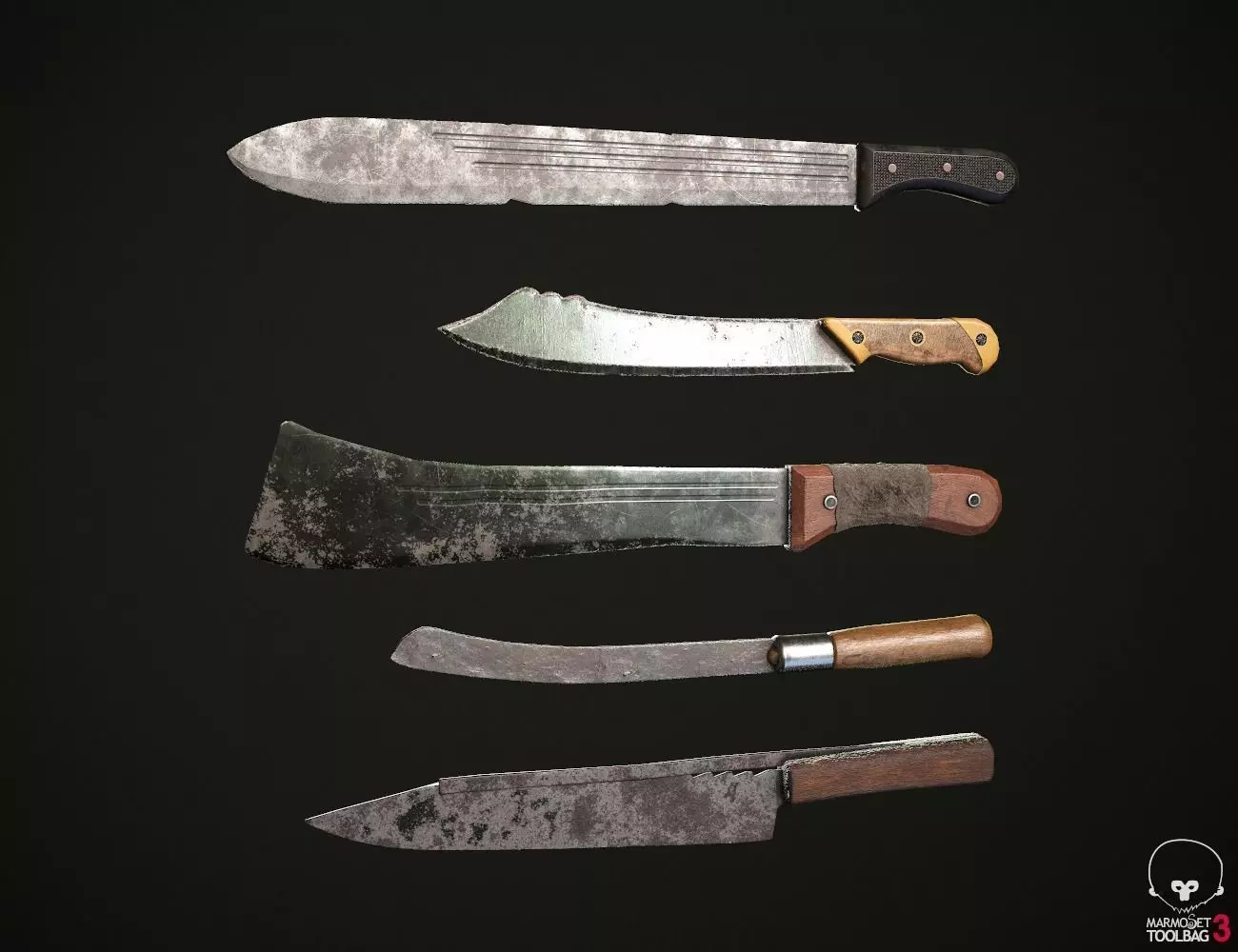 High quality Set of 5 machetes ready for VR/Low poly, includes textures in 2K resolution using PBR Metallic/roughness workflow,