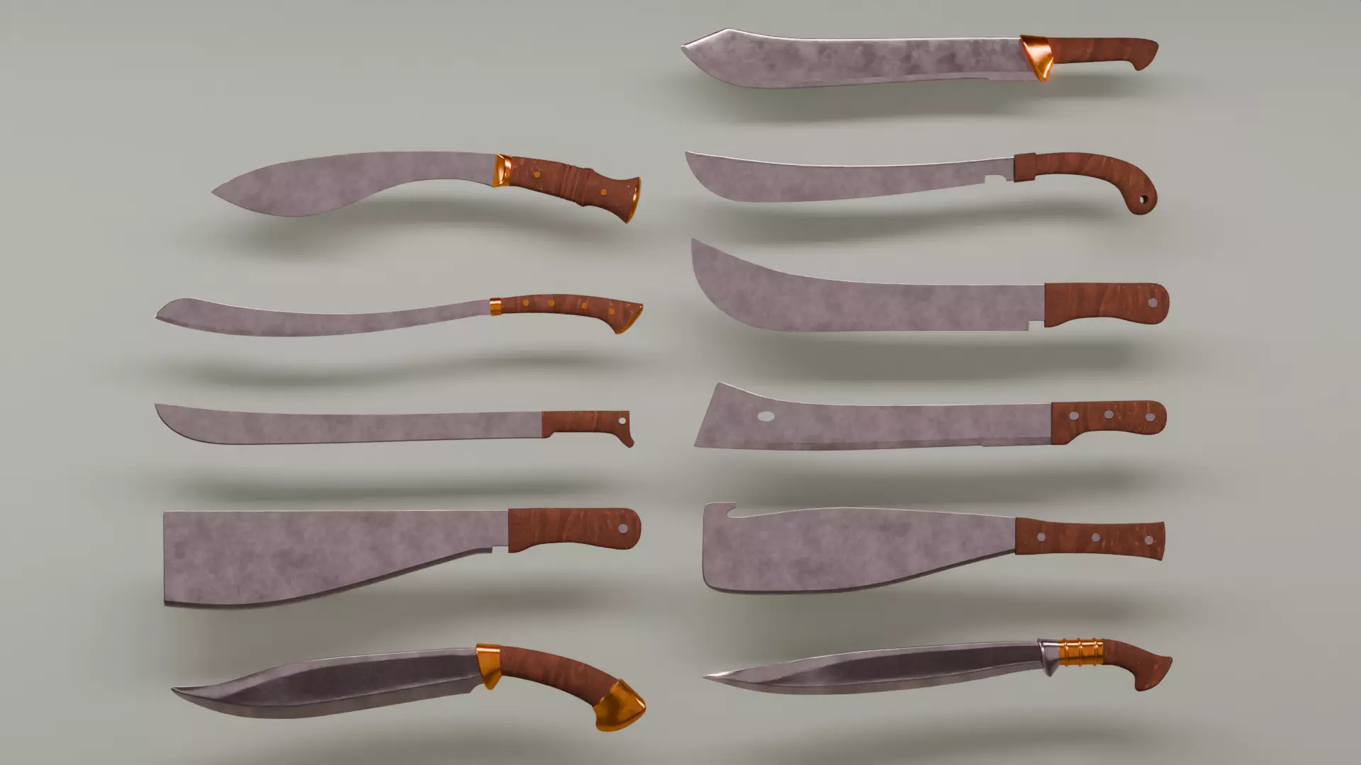 Contains 11 models based on diferent designs of machete/knifes in the world. As well two procedural materials( Iron and Brass)