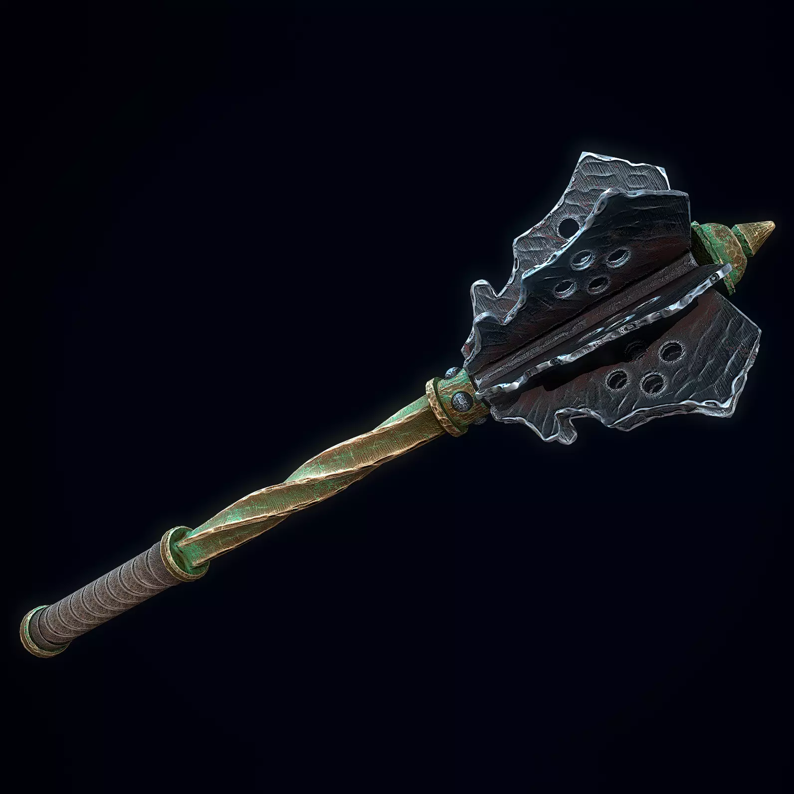 Low-poly 3D model of a Medieval Mace doesn't contain any n-gons and has optimal topology. The archive includes such 2K textures: base color map, metalness map, normal map (OpenGL), and roughness map. Images and video were rendered in Marmoset.
