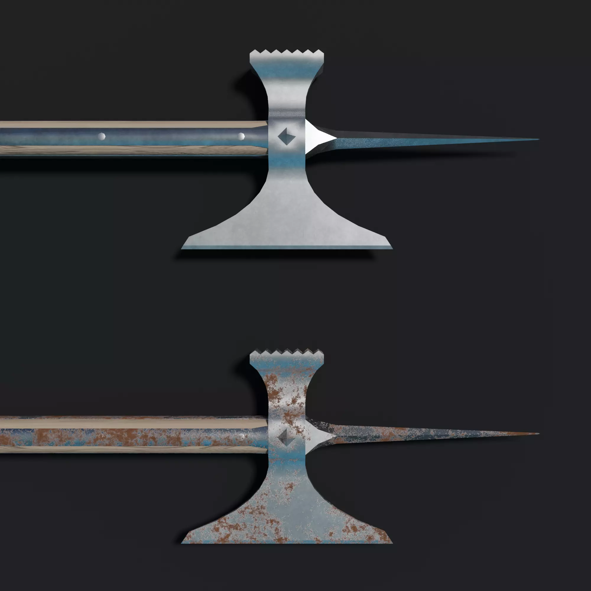 A low poly medieval poleaxe model with standard steel and rusted steel textures.