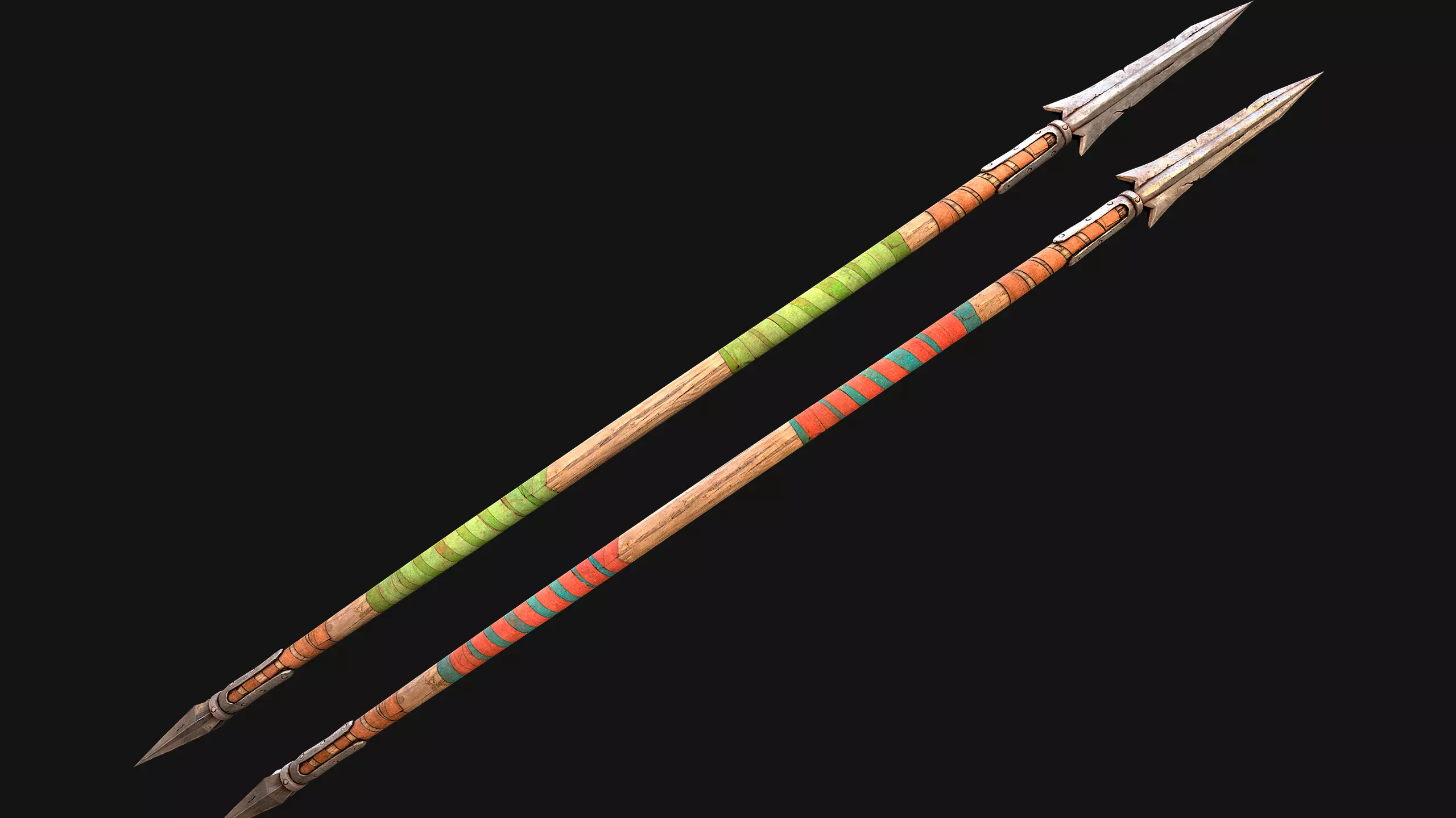 Game ready model .The model contains lods, detailed information on the images.Stylized and detailed Medieval Wooden Spear fully textured, sculpted and rendered with Physical based rendering (PBR) - Shown images have been rendered in Marmoset Toolbag .The model has two color options.