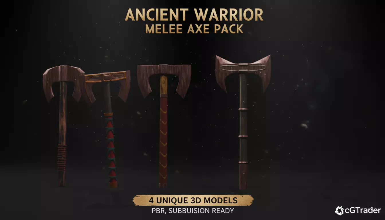 This high-quality 3D asset pack features a collection of four distinct, heavy-duty melee axes, meticulously designed with a blend of rugged tribal aesthetics and ornate craftsmanship. Ranging from primitive wood-bound designs to gold-inlaid ceremonial weapons, this set is perfect for fantasy, historical, or RPG environments.