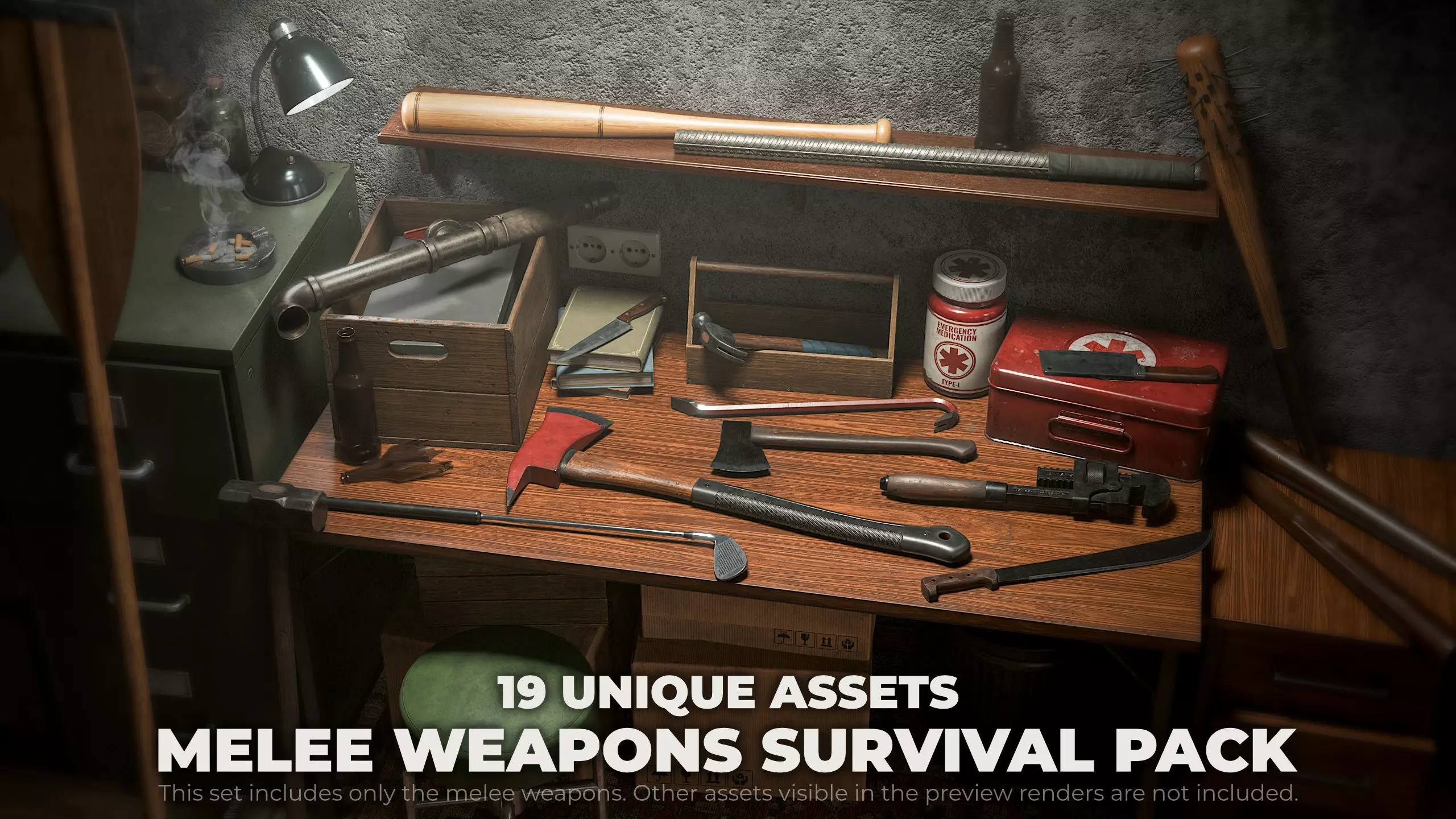 This collection includes a diverse set of makeshift and professional melee weapons designed for post-apocalyptic or survival settings.