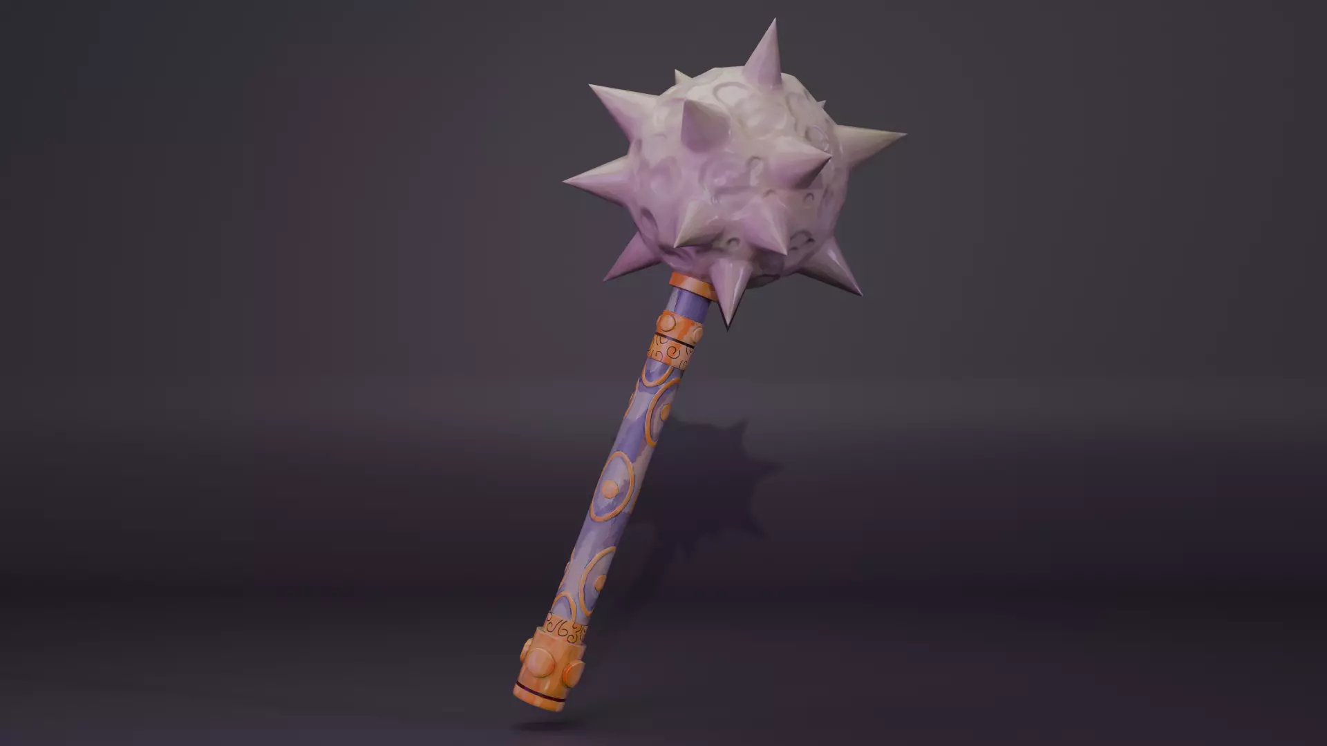 The Meteorite Mace is a stylized 3D weapon inspired by the shape and texture of celestial meteorites. The head of the mace resembles a cratered rock from space, adorned with large, sharp spikes that give it a powerful and intimidating look. The handle is decorated with mystical symbols and circular ornaments in vibrant purple and orange tones, adding a magical flair.