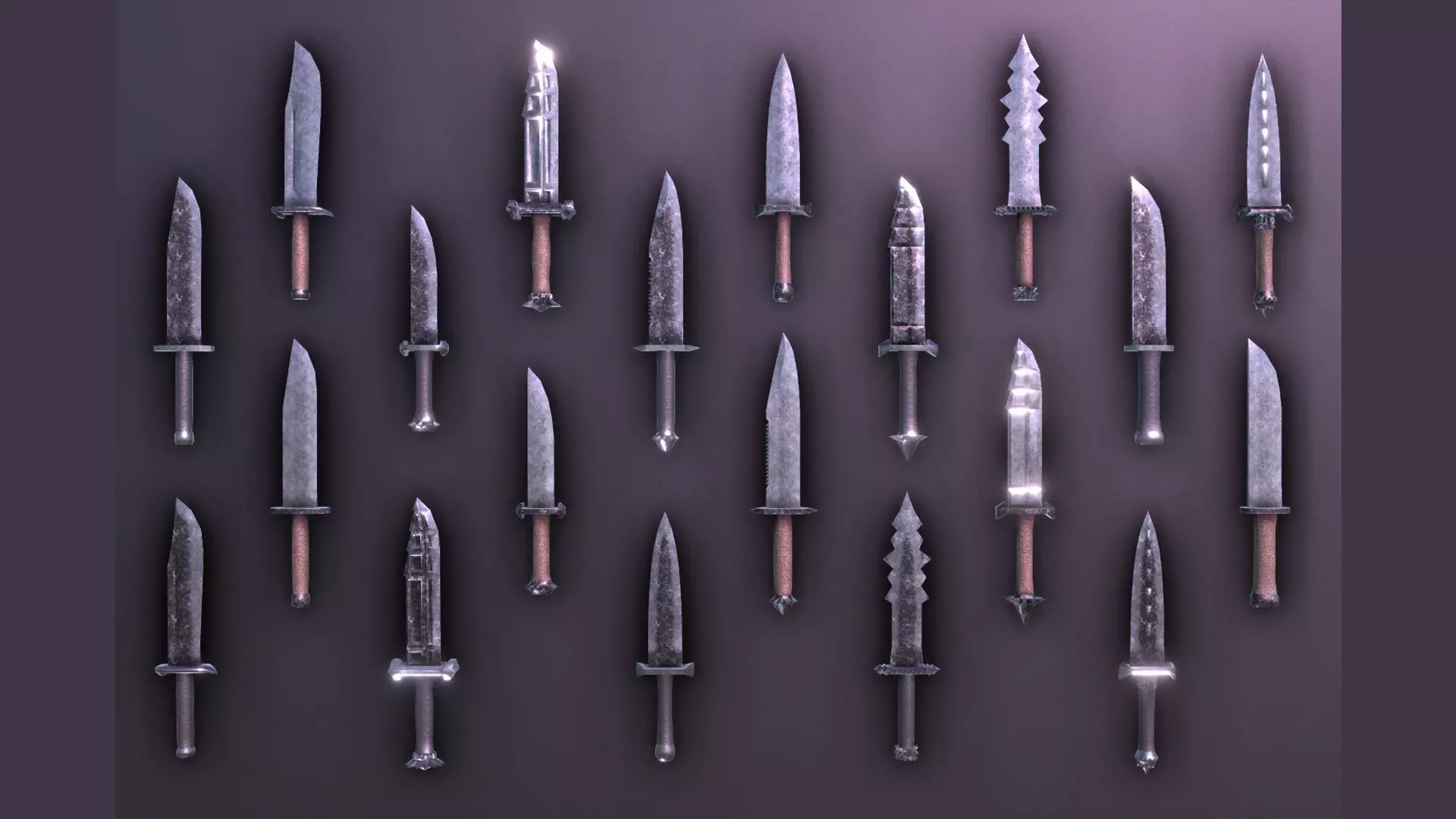 While the complete Modular Melee pack supports over 50,000 possible part configurations, this knife-only subset delivers around 8000 unique combinations in a wide range of stylized knives such as curved, convex, concave, studded, double-bladed, thorned, bowie-style, and more.