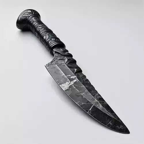 This highly detailed 3D model of an ornate obsidian dagger is perfect for game development, especially fantasy or RPG genres. The model features an intricately carved handle and a unique obsidian blade with visible cracks and imperfections. This makes it suitable for close-up shots and detailed scenes. It can also be used in other applications such as AR/VR experiences, film, and cinematic projects. The model is available in multiple formats (GLB, OBJ, FBX, STL) and is optimized for real-time use in game engines. It's low-poly, but with enough detail for high-quality renders. Key features include clean topology, UV unwrapped meshes, and PBR textures. This dagger is ready to be integrated into your project and adds a touch of dark fantasy to your game.