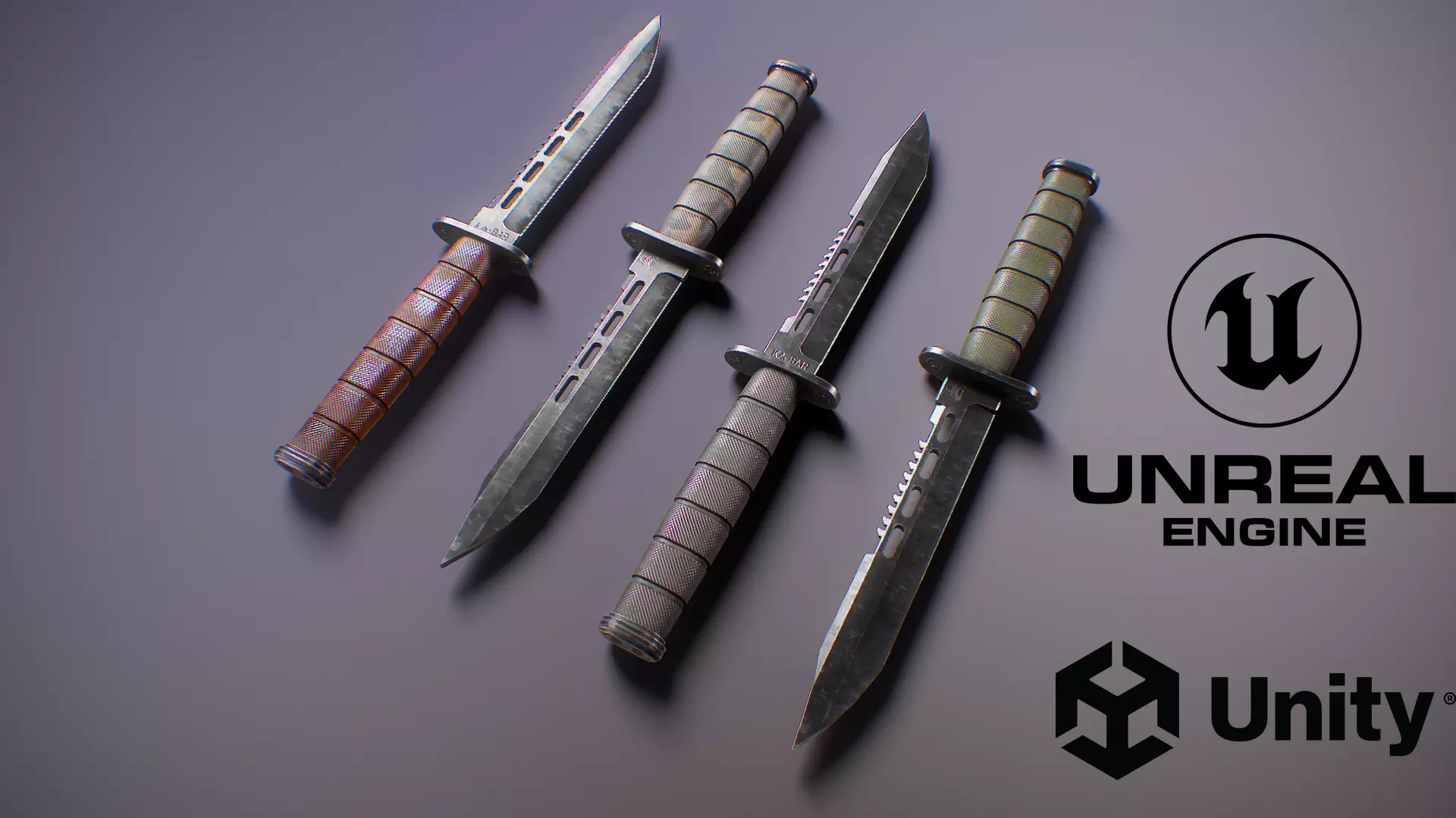 This PBR Futuristic Kabar Combat Knife Set was designed to fit in various scenes. Wether you are setting up a deep space sci-fi shooter or a modern day survival game - the PBR Futuristic Kabar Combat Knife Set fits in many situations. It comes with 4 different versions (Military/Camo/Fake Wood/Dark) and detailed 4K textures set up in Metallic/Roughness so it can even be used as a Hero Asset!