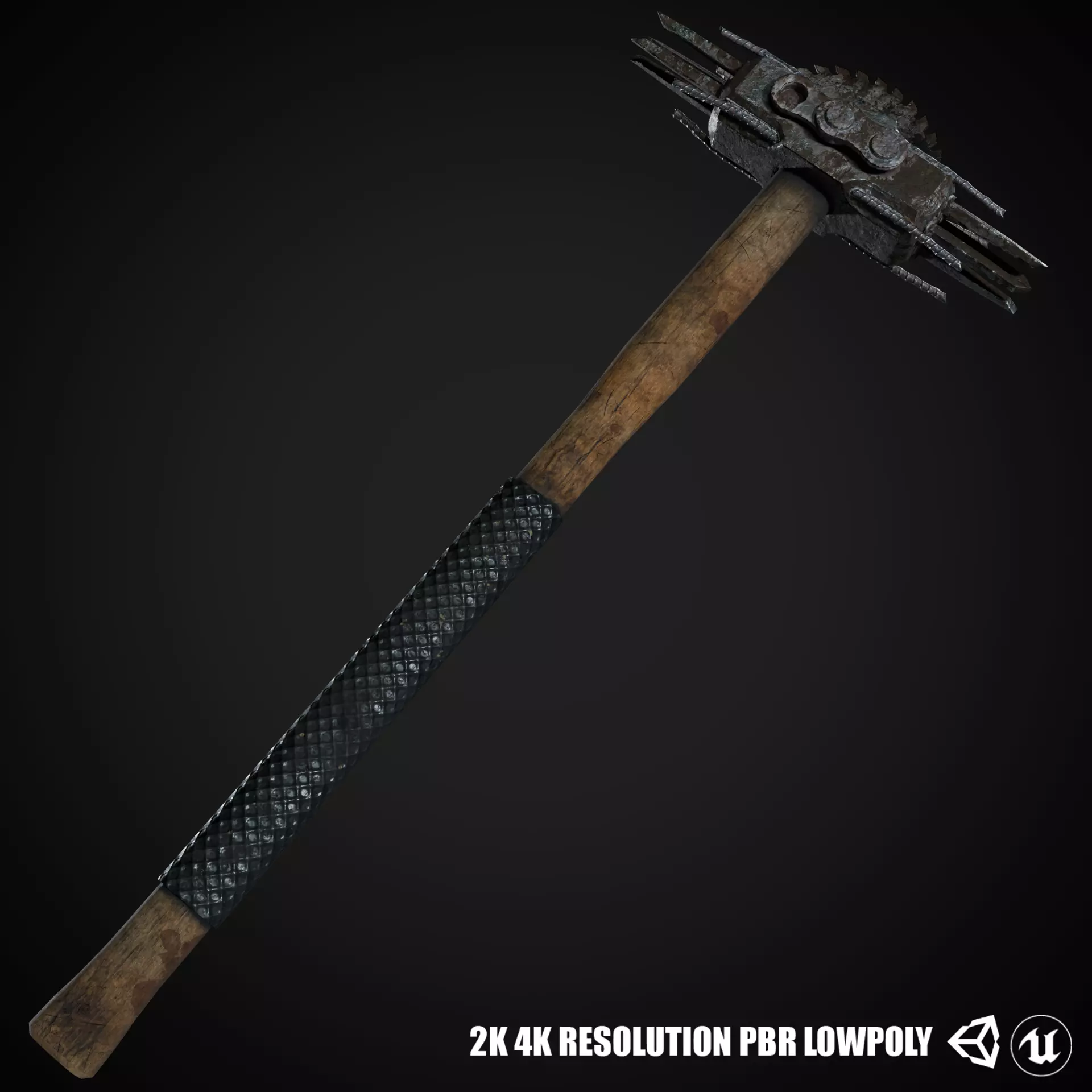 Bring gritty realism to your game or cinematic project with this handcrafted Post-Apocalyptic Spiked Hammer. Designed for survival-themed games and dystopian worlds, this brutal melee weapon features a heavy wooden handle, reinforced with a textured grip and an industrial-grade head equipped with sharp, rusted spikes and a circular saw blade segment.