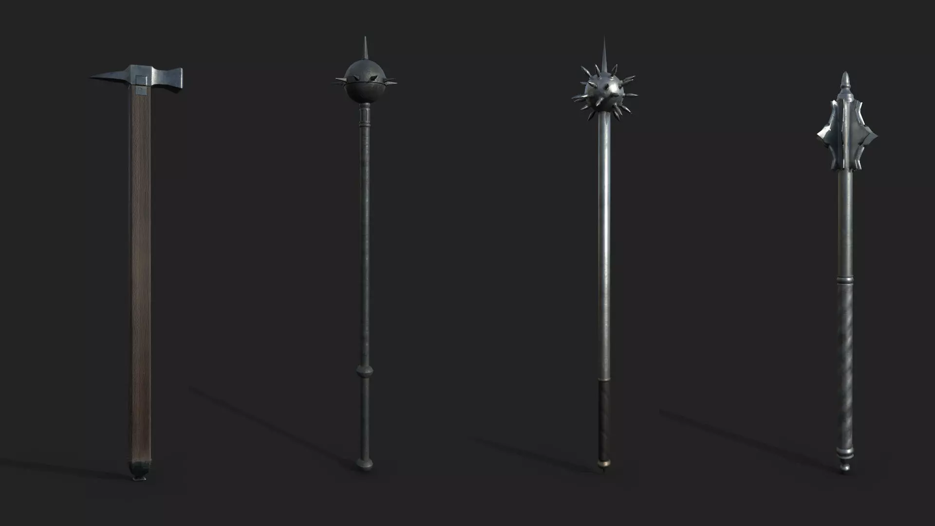 The pack contains 4 medieval maces built to real world scale based on archeological data and replicas. The types are: 1x German Mace, 1x Gurz Mace, 1x Morningstar, 1x Warhammer.