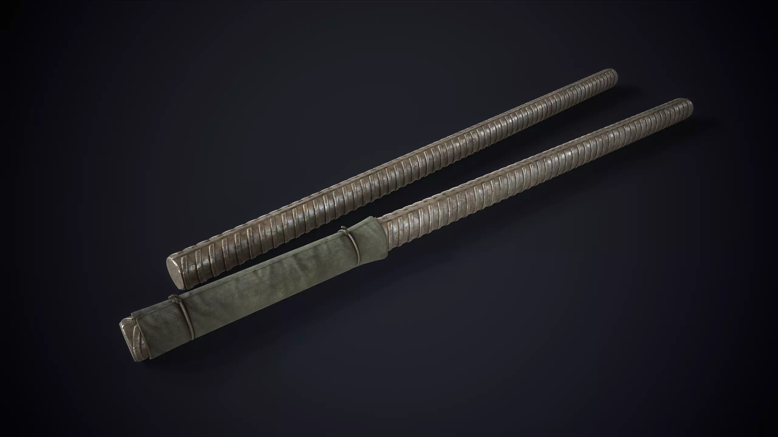 This model provides a metal rebar in two variants: a plain, weathered bar and a version featuring a wrapped fabric grip.