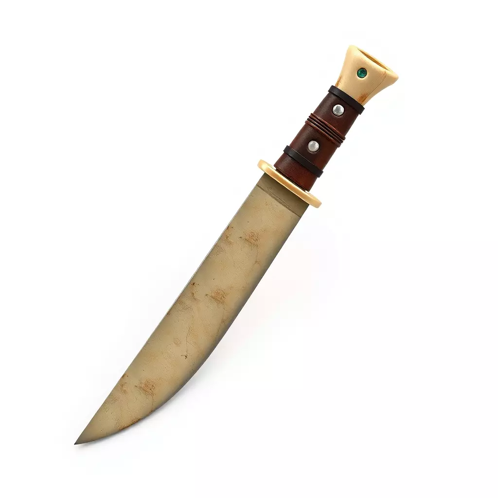 This is a meticulously crafted 3D model of a rustic combat or hunting knife, featuring a weathered blade and an elaborately designed handle. The blade exhibits realistic wear and scratches, giving it an authentic, aged appearance, perfect for a gritty, lived-in feel. The hilt is composed of a rich, dark wood or leather-wrapped grip, secured with rivets, and capped with an elegant, bone-like pommel adorned with a striking green gemstone inlay. A brass-colored guard separates the blade from the handle, adding to its robust construction and aesthetic appeal. This versatile model is ideal for a wide range of digital projects, including immersive game development (fantasy, survival, historical RPGs), realistic architectural visualizations as a prop, engaging augmented reality (AR) and virtual reality (VR) applications, and detailed digital art compositions. It is optimized for real-time rendering environments, ensuring smooth performance in interactive experiences, while also being perfectly suited for high-quality static renderings and cinematics. The model boasts clean, efficient topology, making it easy to integrate into any scene, and is fully UV unwrapped with comprehensive PBR (Physically Based Rendering) textures for maximum visual fidelity and realism across various lighting conditions. Supported file formats include GLB, OBJ, STL, ABC, DAE, FBX, USD, and PLY, ensuring broad compatibility with major 3D software and game engines.