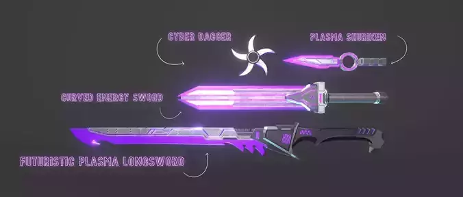 1x Curved Energy Sword1x Futuristic Plasma Longsword1x Cyber Dagger1x Plasma Shuriken