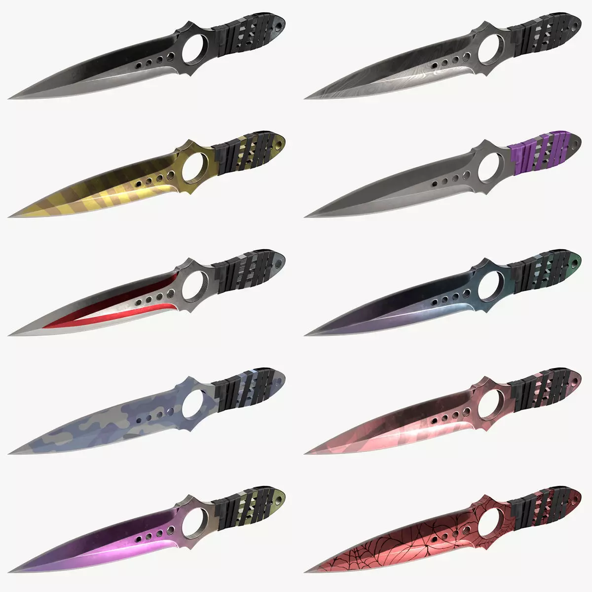 The high-poly realistic 3D model of Skeleton knife with differents skins. This is a set of 10 different skins.