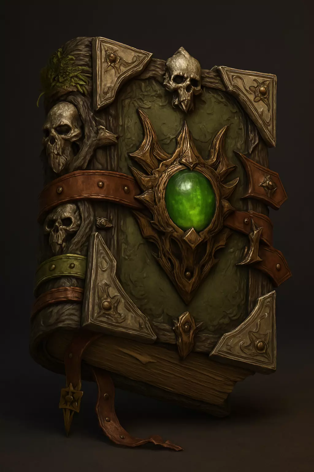 This highly detailed fantasy magic book features a dark ornamental design with skull decorations, metal bindings, and a glowing green gemstone centerpiece. Perfect for dark fantasy worlds, CGI environments, and collectible sculptures, this model combines mysticism with gothic artistry.
