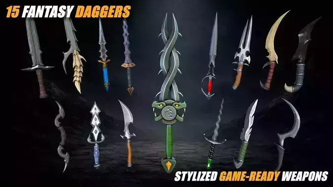 A high-quality stylized fantasy weapon pack featuring 15 unique daggers designed for RPG, fantasy, and stylized game projects.Each weapon is crafted with clean topology and detailed 4K PBR textures, making the pack suitable for real-time use, cinematics, or rendering workflows.