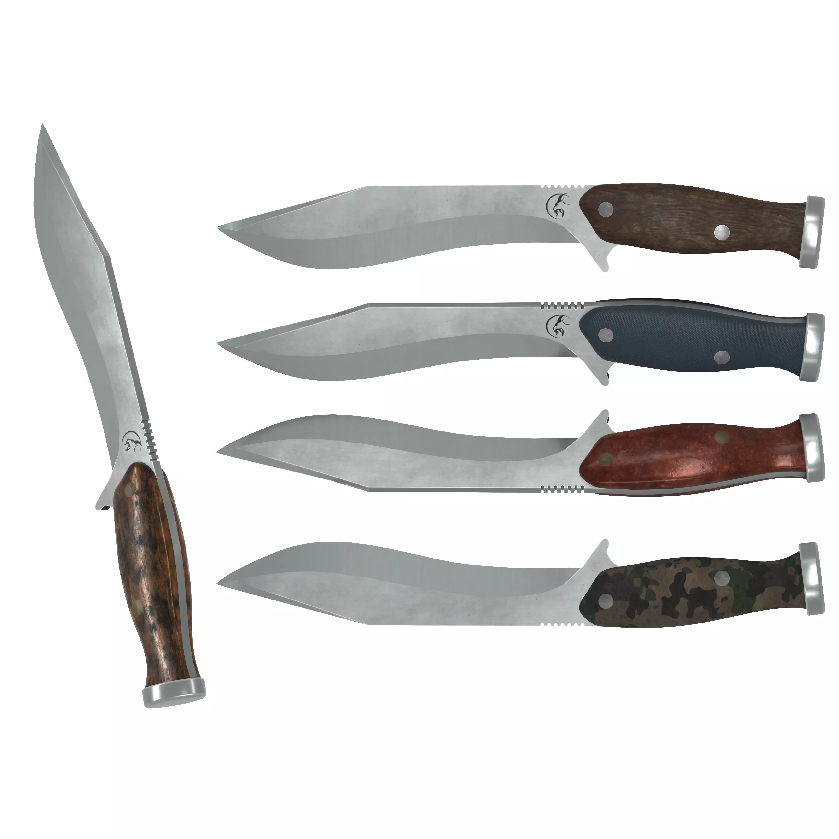 A very detailed Survival Knife (Model 1) with 4k High-Quality PBR Textures. The blade has a detailed scratched steel base and the handle has 5 skins wich you can choose.This knife is from a pack with 5 knives, this one is the Model 1.