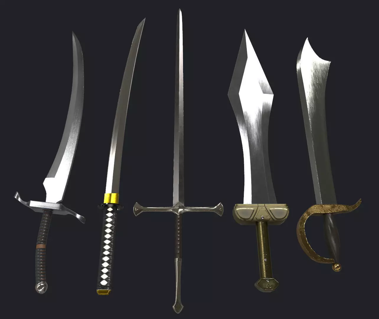 What you see here is a sword pack, containing 5 different swords. Each sword will be made available separately, for those of you that only need a specific one (but why have one when you can have all?). Each sword is low poly, ranging from between 500-2,600 polys. In the pack, there's a Katana, Longsword (it's beautiful!!), Elf sword, Pirate sword, and a Roman style sword. All textures are PBR. Each sword is broken down in the same way. There are fbx and obj file formats for each sword. There are also 3 zip files for each sword. One contains the standard PBR textures. The next has Unity textures, made for the Standard metallic shader. Lastly is the Unreal folder. Each unreal folder comes with the fully set up Unreal asset. All you have to do is unzip, drag and drop, and it's good to go. Lastly is the actual sword folder. That one is also for Unreal, with all the swords in there, ready to go. Each sword has their pivot centered on the handles, so there are no worries about getting the sword into someone's hands (hopefully to fight evil doers). Anything specific you may want can be granted upon request. Enjoy!