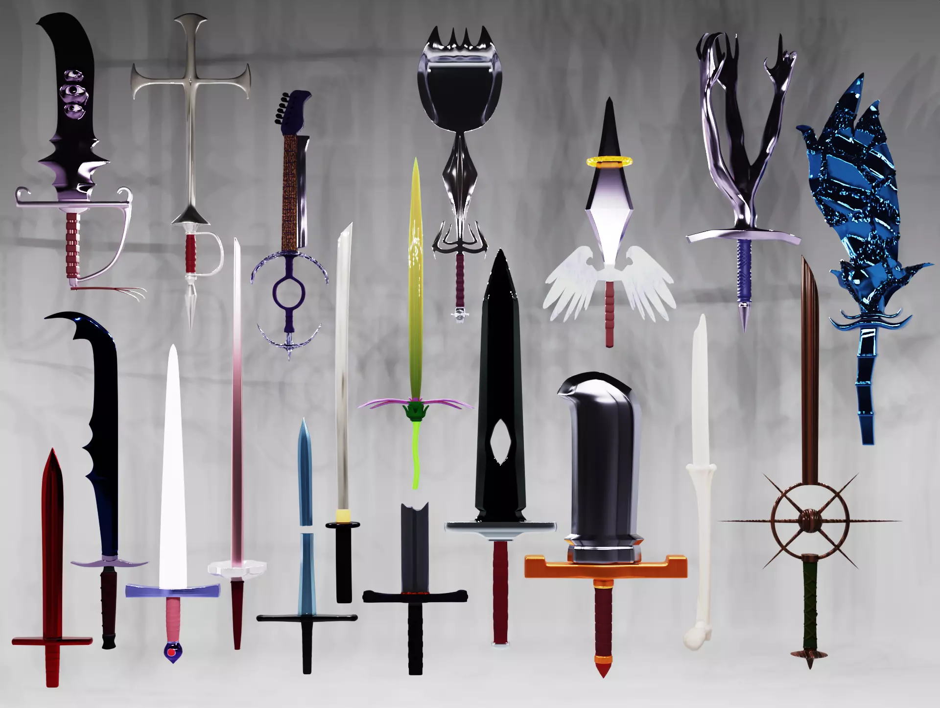 19 different swords with random shapes from basic generic swords to some outlandish ideas and silly ones too. Includes fiddling with basic materials for easy reuse of either the material or the whole sword. Created and rendered in Blender 5.0 tested with both EEVEE and Cycles.