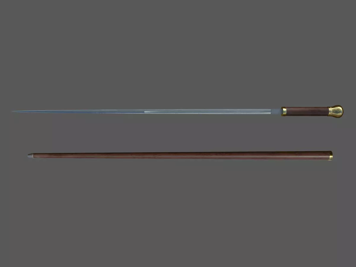 Two game/VR/AR ready low-poly models of a 18th or 19th century swordstick (one model for the blade and one model for the scabbard) with 2K PBR-textures built to real-world scale (metric system). One of the models is the actual sword, while the other is the scabbard. The origo of both models line up with each other.