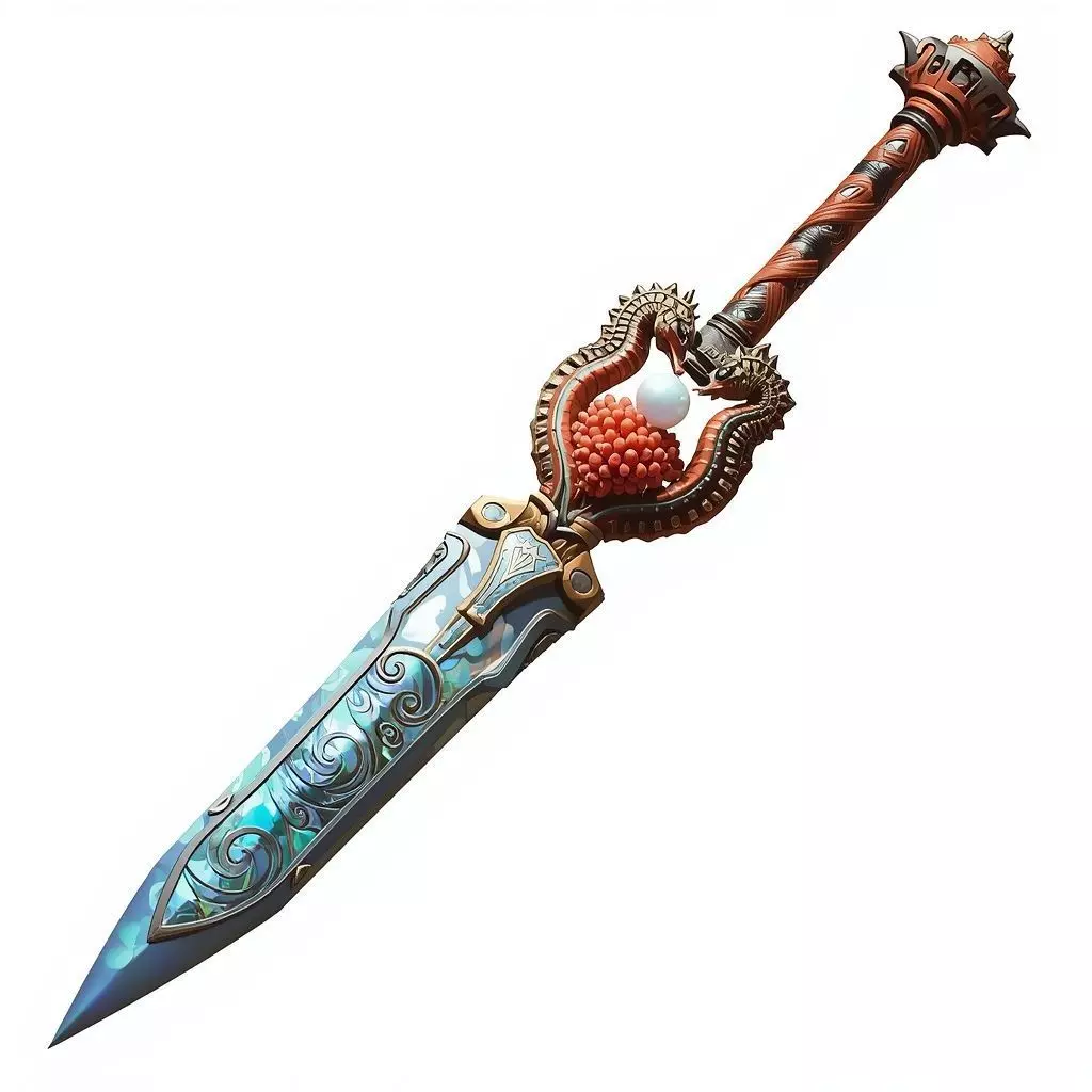 Coral and Pearl Heart Nestled right between the seahorses is a cluster of vibrant red coral holding a large, lustrous white pearl. This acts as the centerpiece of the weapon, contrasting beautifully with the metallic and blue tones around it.