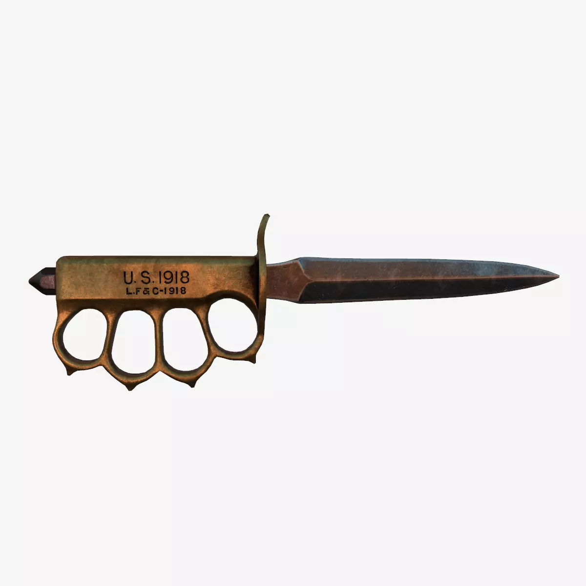 US Mark I trench knife. Large, dagger with silver-coloured metal blade, integral knuckle duster in the brass-coloured metal handle. With a sharpened pommel. Inscribed on handle: U.S. 1918, L F & C 1918. Metal formed scabbard with integral belt loops. Marked L.F.&C 1918. Knives like this were used during World War I for close fighting in trenches.