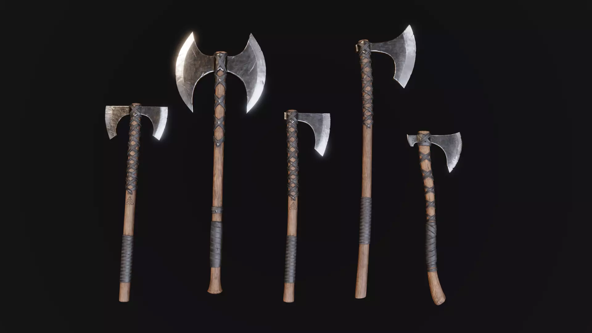 The handles of these weapon are either curved or straight with a big axe head on top fit for a fierce berserk. The head of the axe is made from hardened steel and the handle is wooden with realistic texture and wood rings wrapped around with black leather. The overall look of the axes is new with a few scratches and other damage it suffered in battles. Perfect for any medieval viking character or environment.
