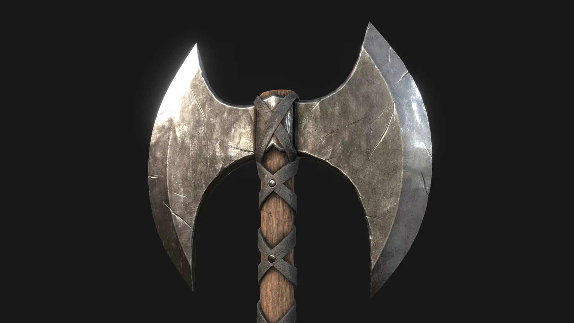 The build of the weapon is thick and straight with a massive double bladed head on top. The double bladed head of the axe is made from hardened steel and the handle is wooden with realistic texture and wood rings wrapped around with black leather. The overall look of the axe is new with a few scratches and other damage it suffered in battles. Perfect for any medieval viking character or environment.