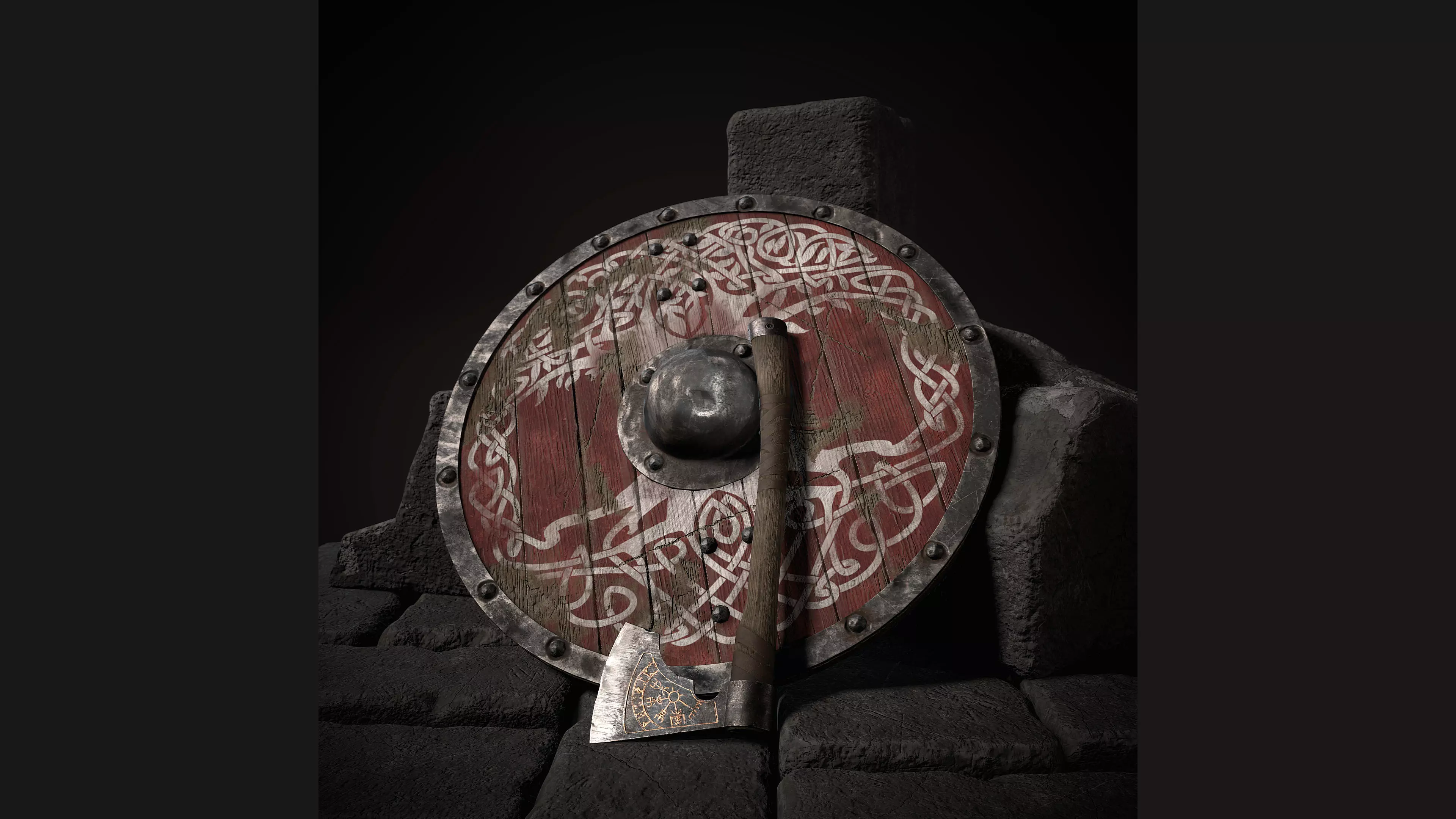 This is set of 2 Game ready models of vikings round shield with Yggdrasil world tree scandinavian ornament and Medieval Viking battle axe. These items are the first things a viking takes into battle. These high-quality models have detailed textures of painted damaged wood and old iron with many different details of shabby, scratches and surface damage, as well as with a layered paint effect.