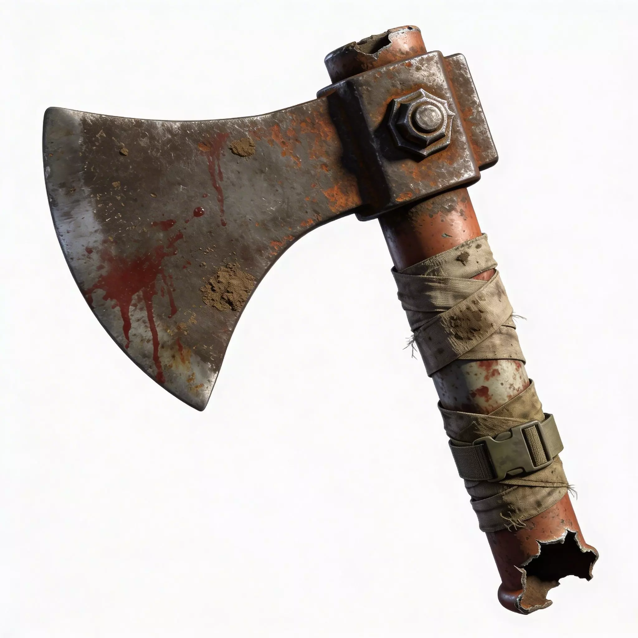 Tagshatchetaxepost-apocalypticrustedsurvivalweaponmeleewastelandimprovisedtacticalbloodyindustrialscavengedpipemetalsteel3d assetsurvivalistcombathorror
