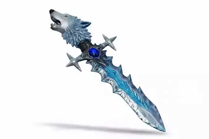 Howling Wolf Pommel The top of the handle features a beautifully sculpted head of a white wolf. The texture blends realistic fur with a frosted, icy finish, making it look like a spirit beast frozen in time. It adds a fierce, wild personality to the hilt.
